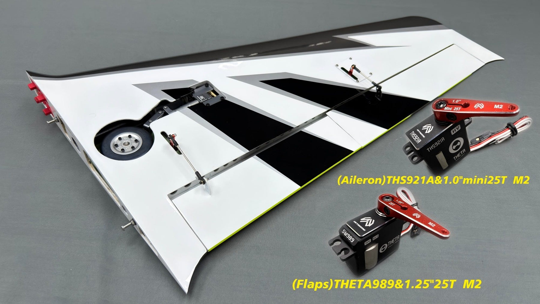 - Flaps: 2x Theta SW989 servos with 1.25" servo arms.